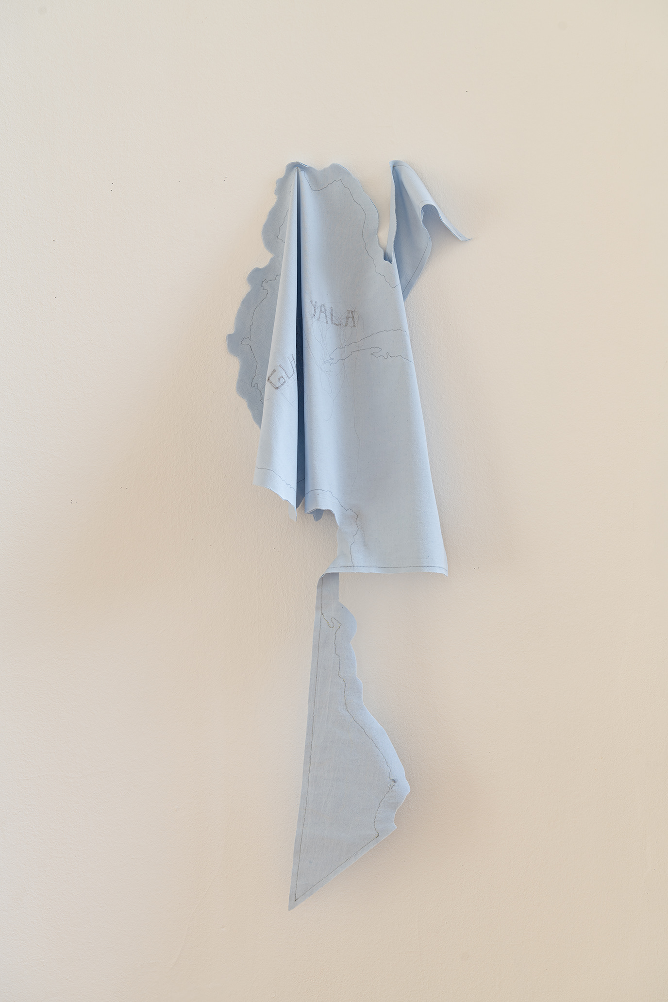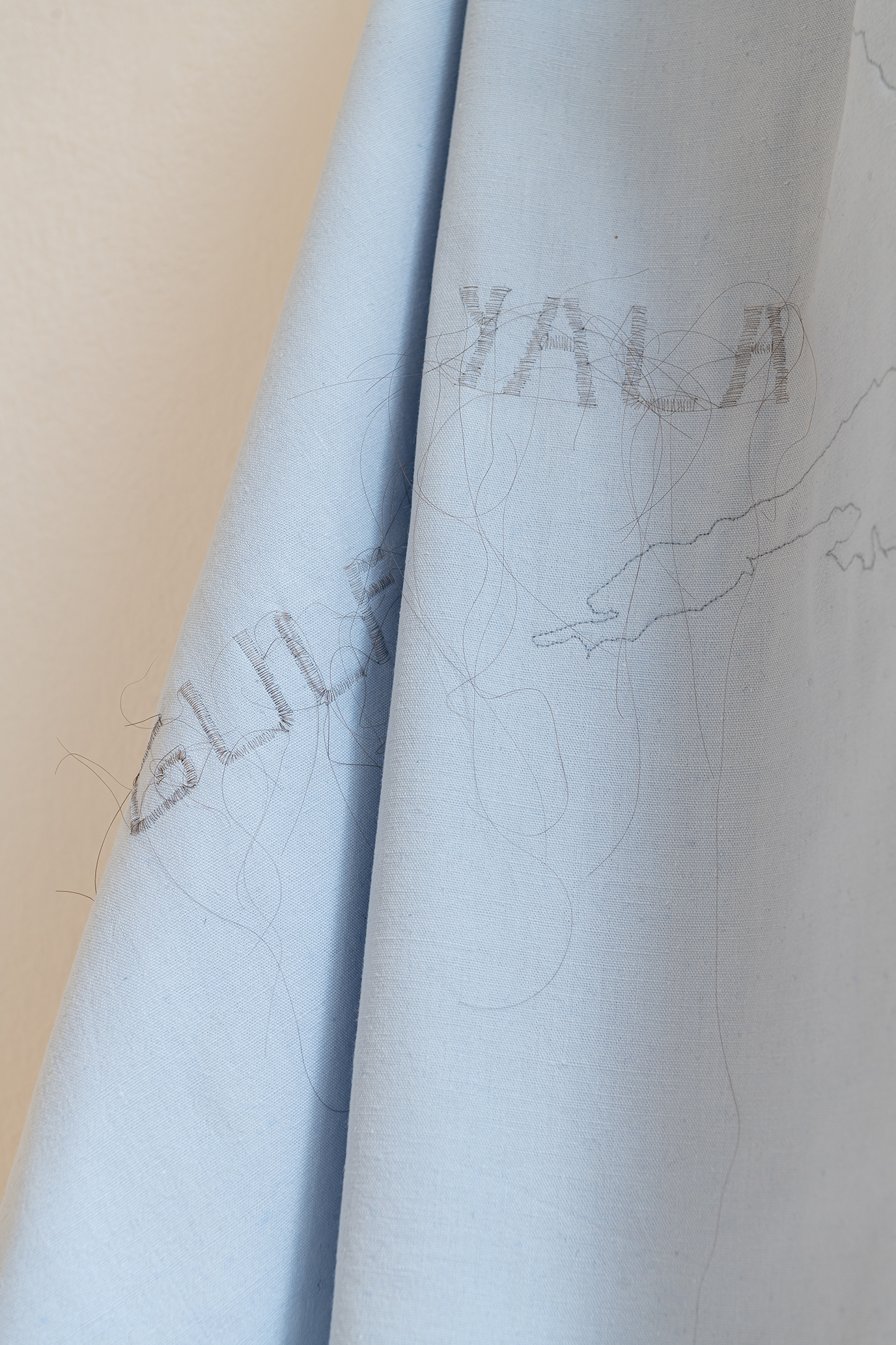 Yala. In critical discourse, it is used by the indigenous peoples of this region as the name for the landmass we know today as America. It originates from the Guna culture and translates as “land in full bloom.” In reflection on my own roots and in solidarity, "Gulf of America" is embroidered with my hair on a light blue bedsheet. With its shape, color, and drape, the sheet evokes the water that surrounds these land masses and, as the Maori say, connects them. The material refers to an everyday sphere in which, however, the private andthe political are connected on many levels. The hair embroidery on the textile evokes moments of disturbance, such as hair left behind on a hotel bed, tangled in a fiber of a freshly washed shirt, or lurking in the soup.