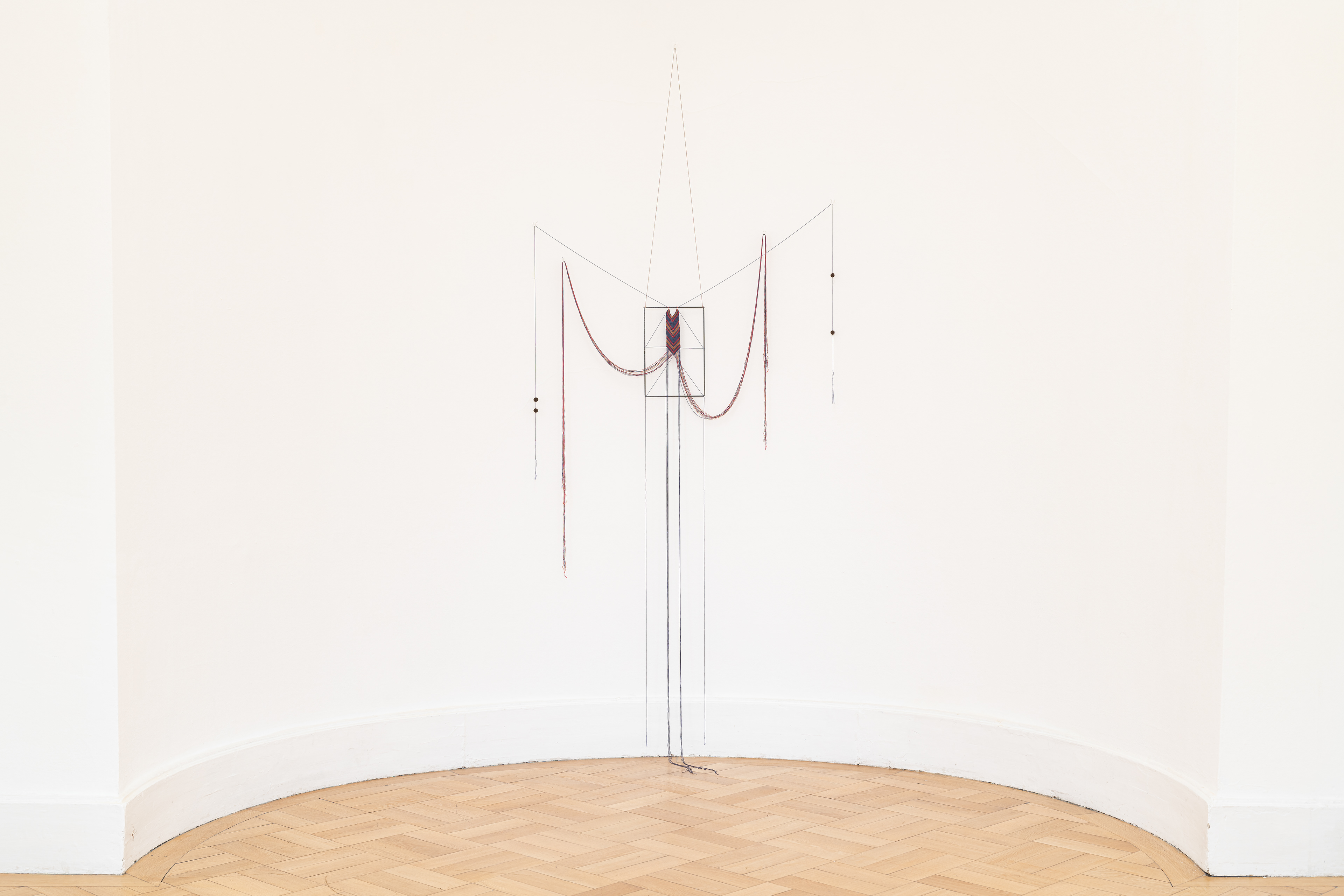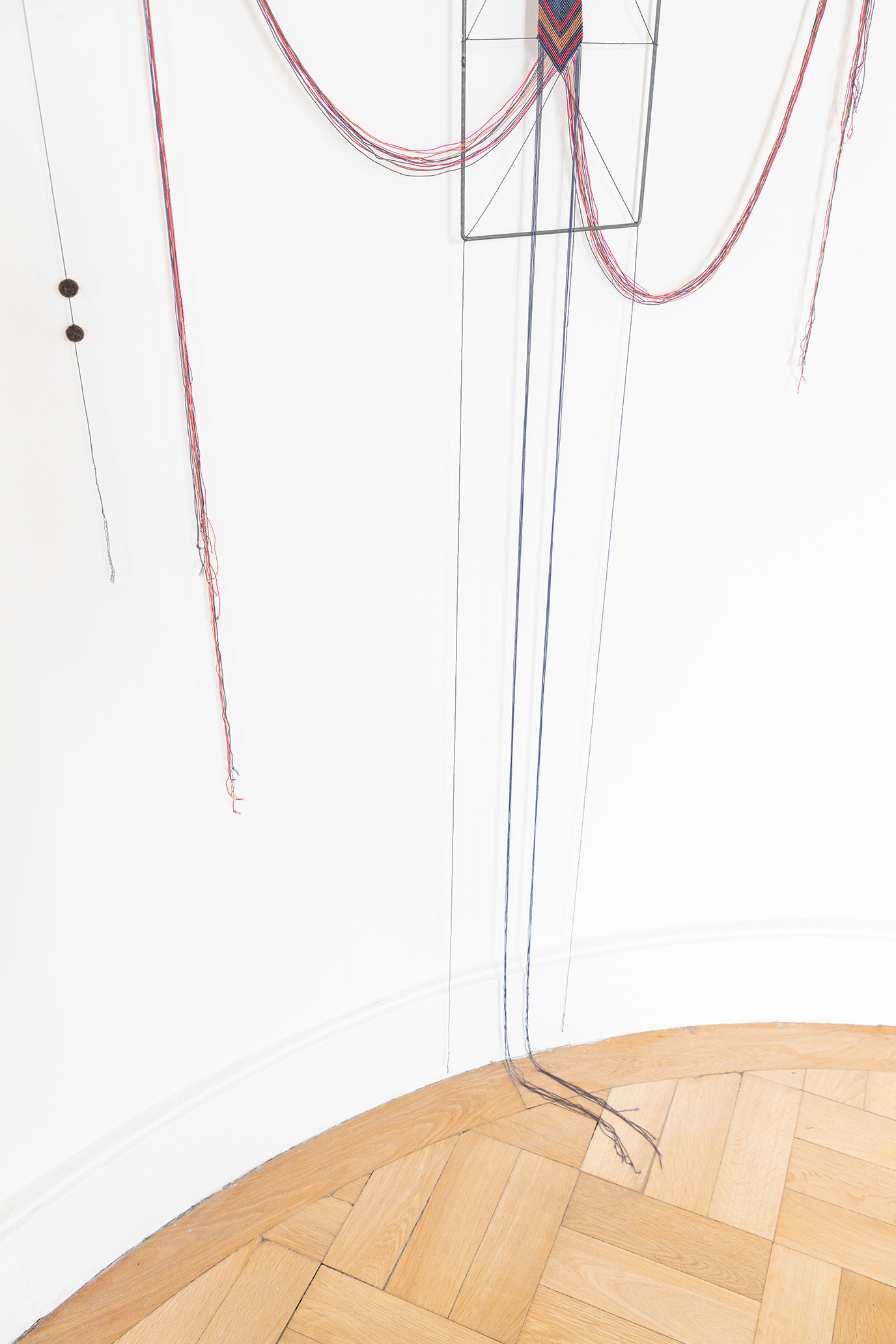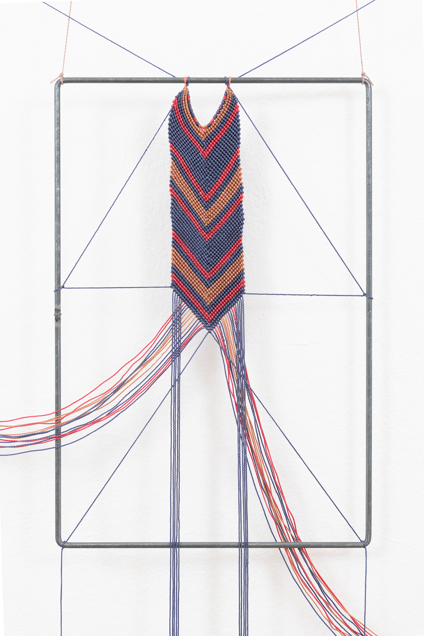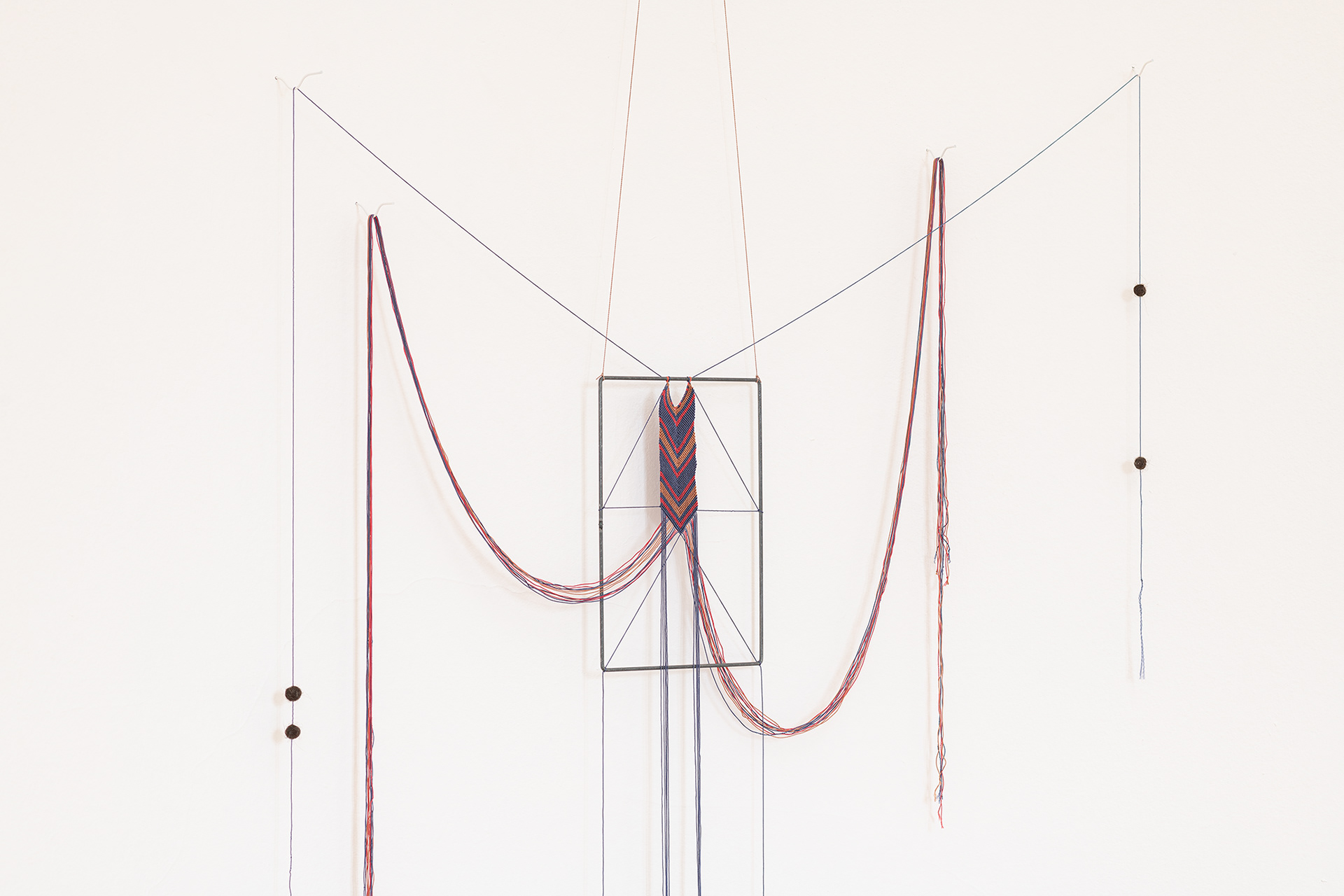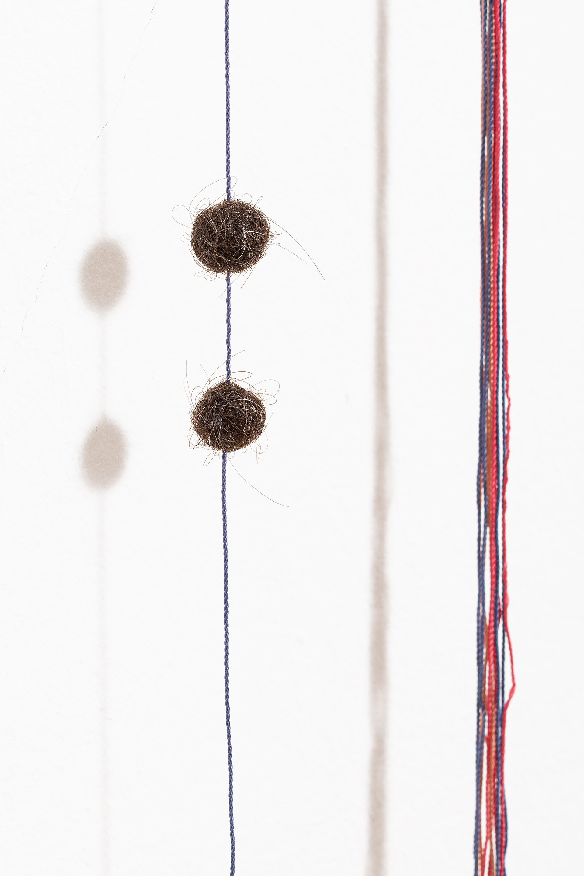 The work deals with textile communication systems that convey meaning through color, form, and material. In addition to patterns, as found in woven fabrics, a knot can also be a carrier of meaning. The principle of knots and non-knots refers to the binary system of 1 and 0 and was used by the Quechua in their quipus / kipus. The processed hair carries my genetic material and, under the right conditions, can provide information about my organic system thousands of years later. It therefore retains information, but at the same time also refers to transience, as gray hair is also visible. The work addresses time on different levels, and thus also establishes a connection between our digital everyday life and the pre-Columbian information system of the quipus / kipus.