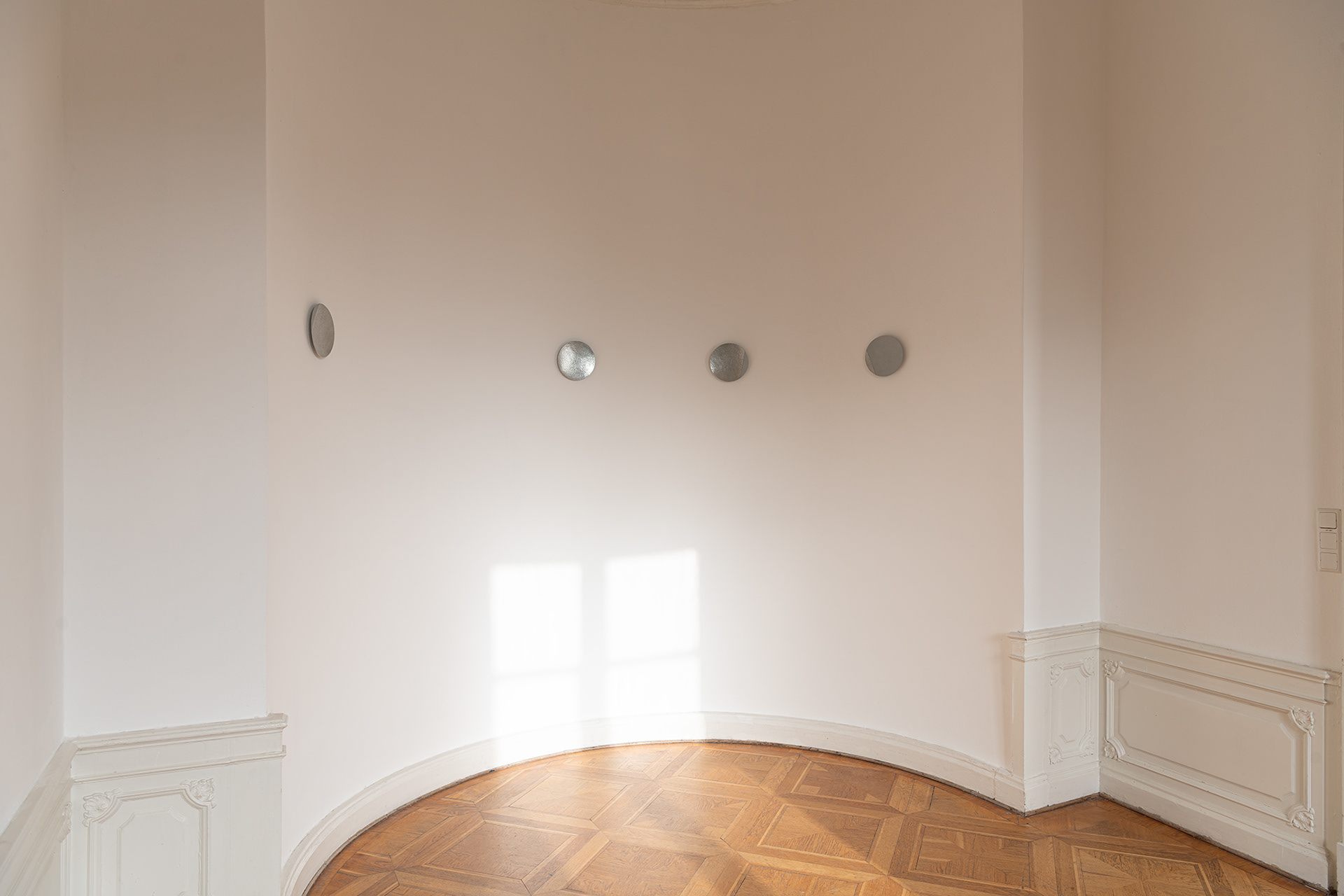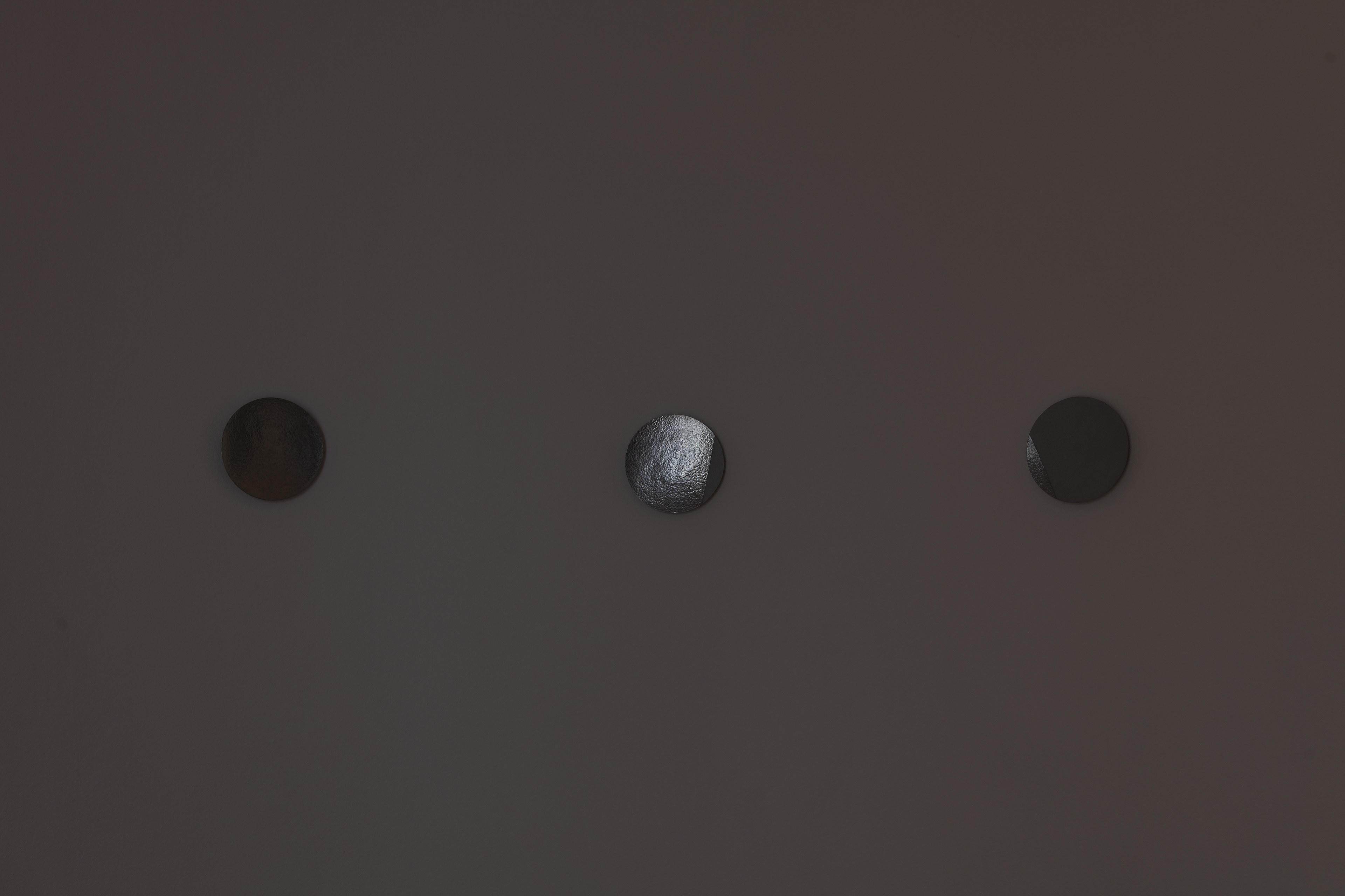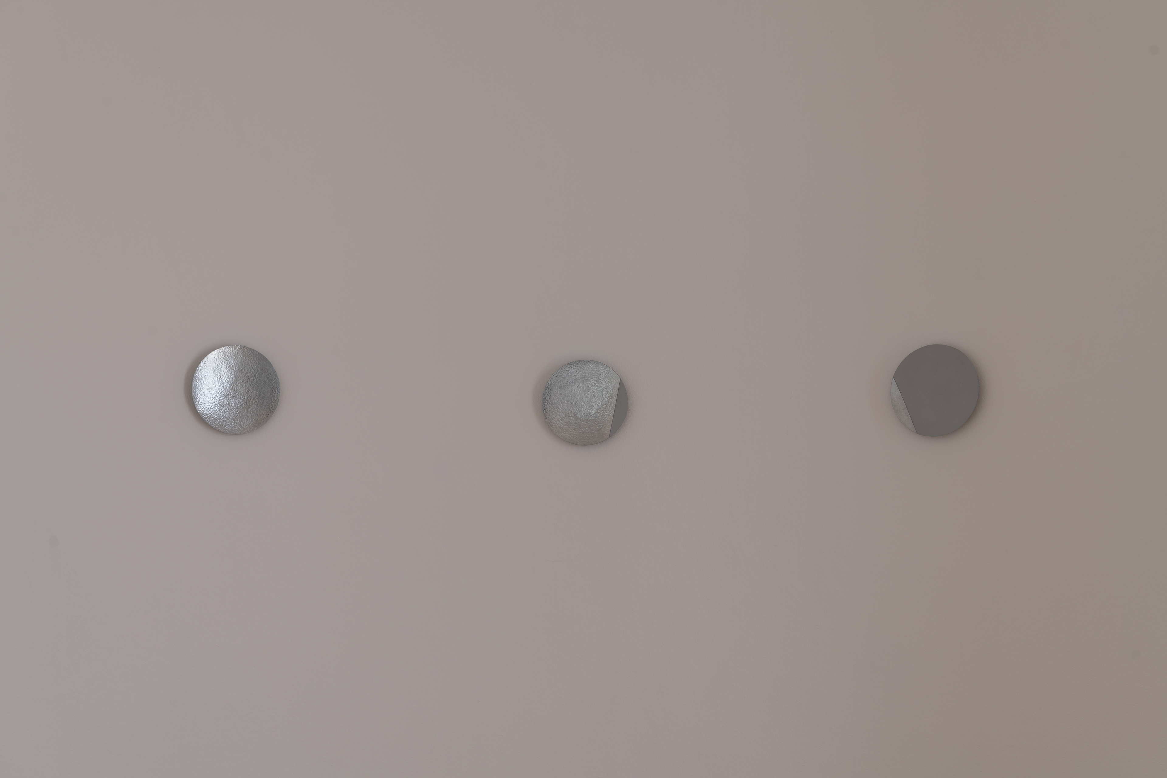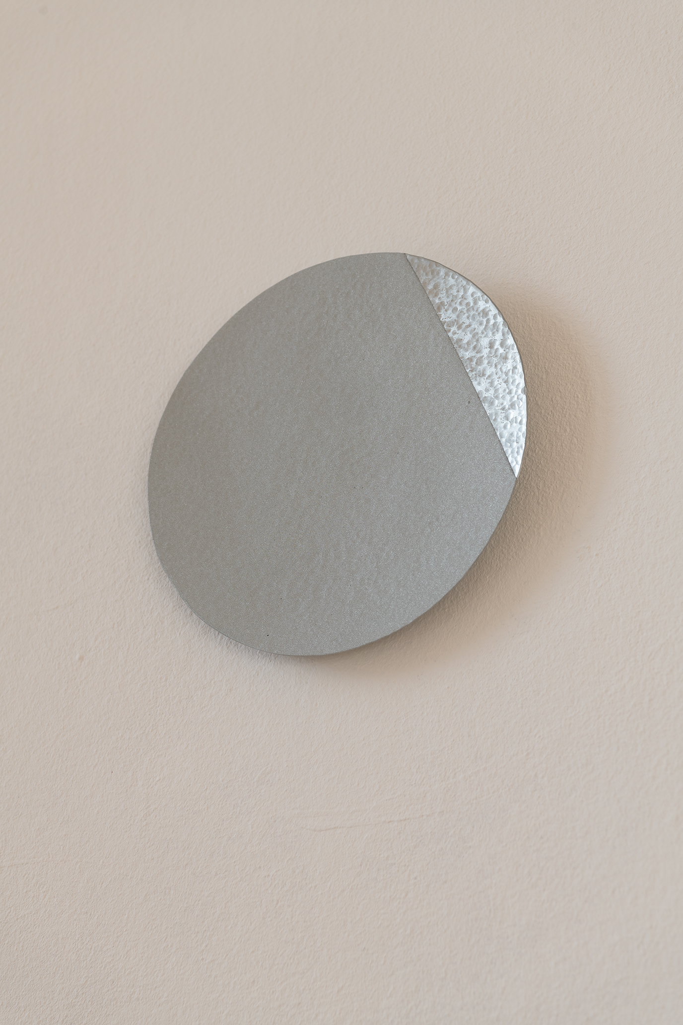 The work was developed as part of the 2025 Master Students‘ Exhibition for the Kunstverein Braunschweig and deals with the circular perception of time. Seven hammered zinc sheet discs represent the phases of the moon that the exhibition went through from October 18 to November 9, 2025. They are distributed throughout the unlit room and thus reflect only the natural light and the light coming in from the neighboring rooms. The sandblasted surfaces represent the part of the moon that remains hidden from us. The work deals with visibility and invisibility and addresses the limits of our perception. It also invites visitors to linger in the room for a longer period of time, to observe the change in lightand thus the passage of time, or to return
