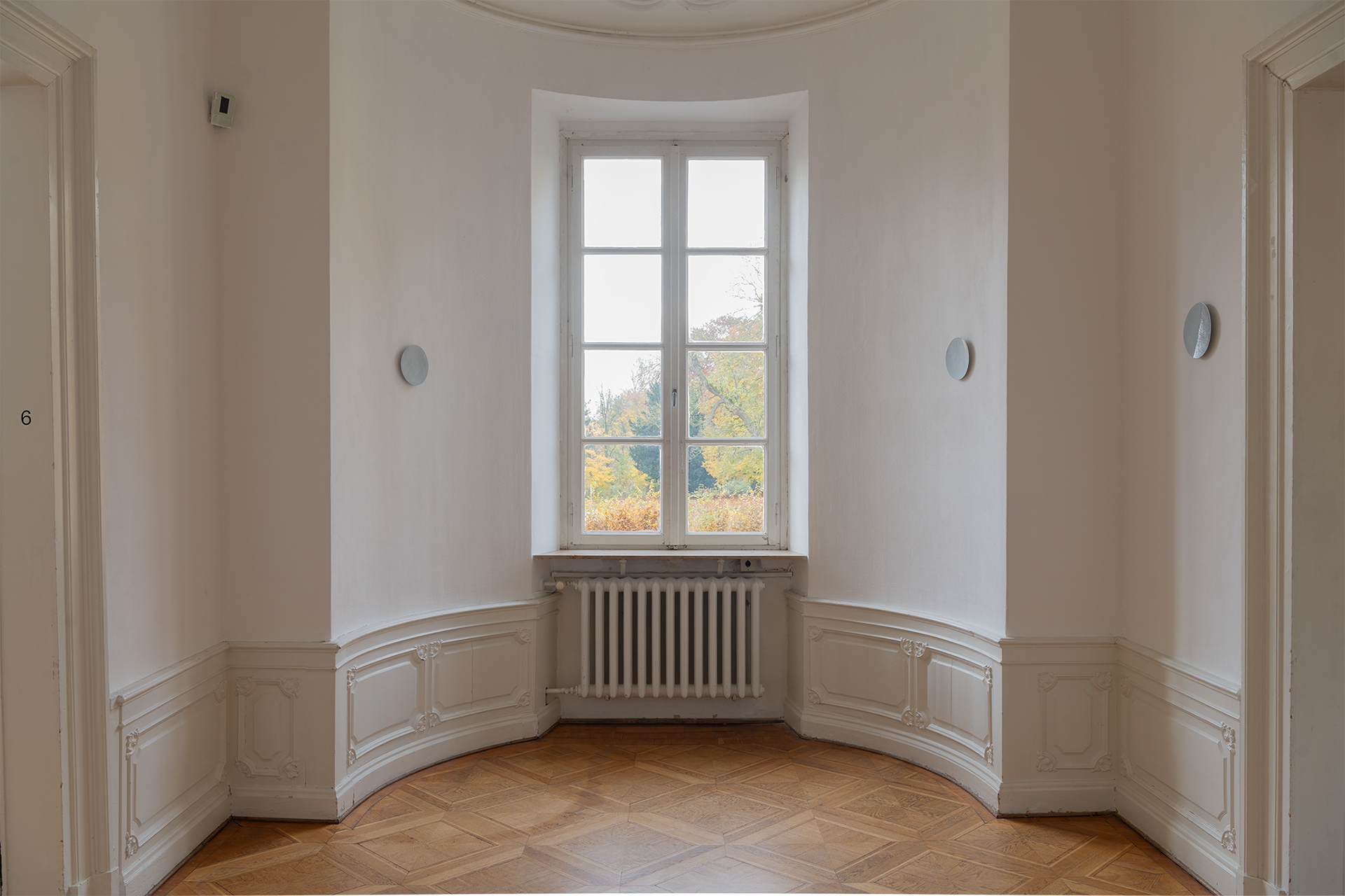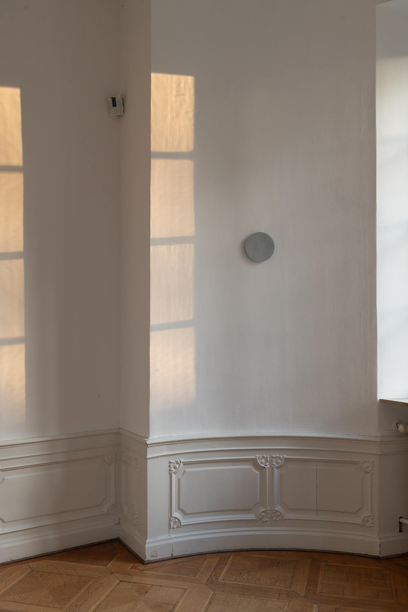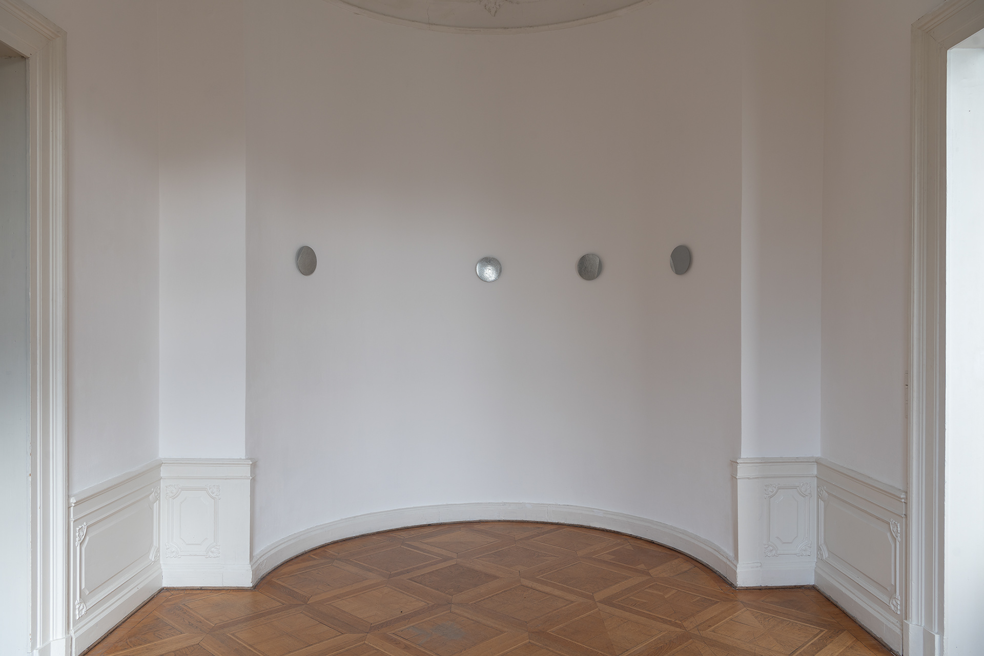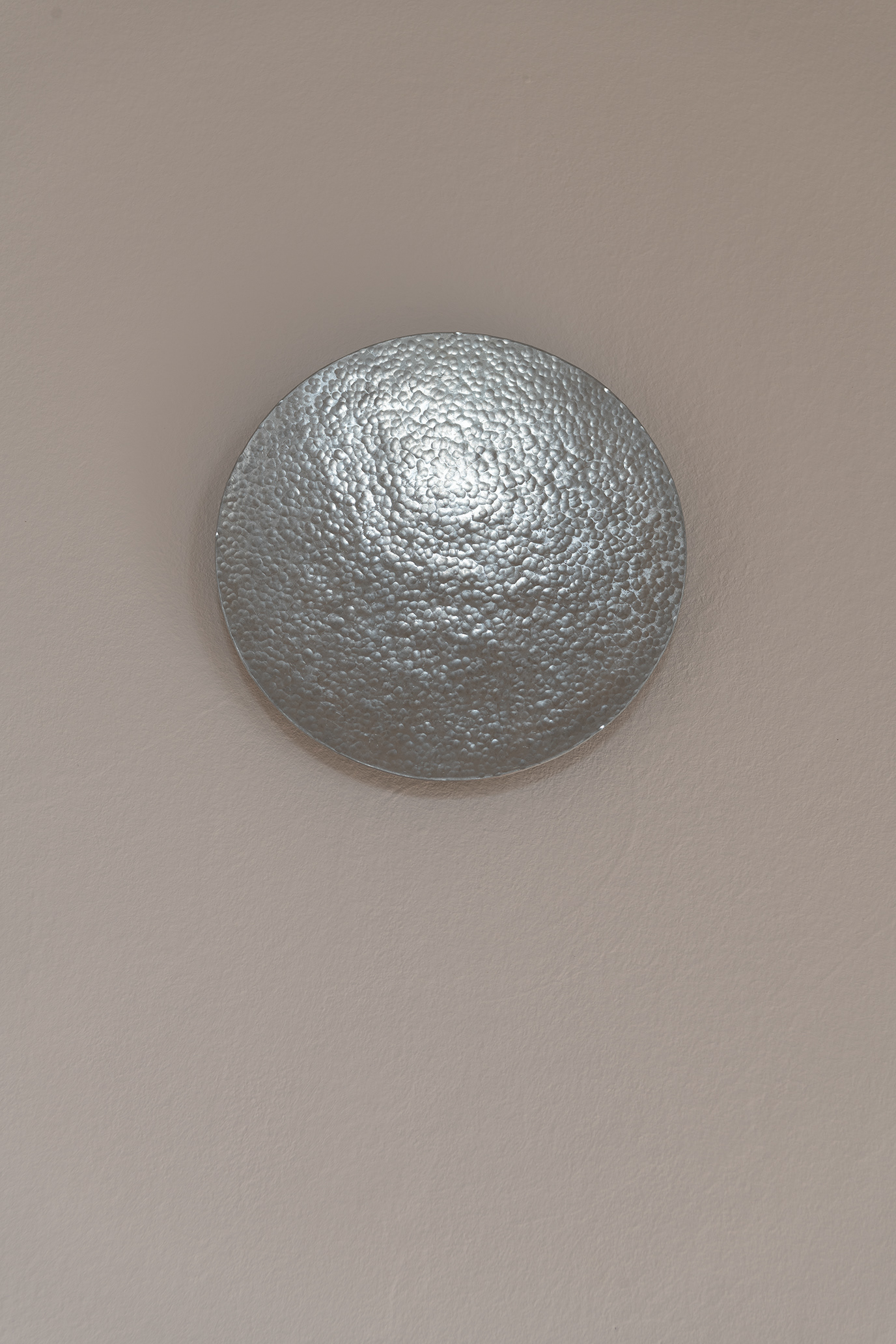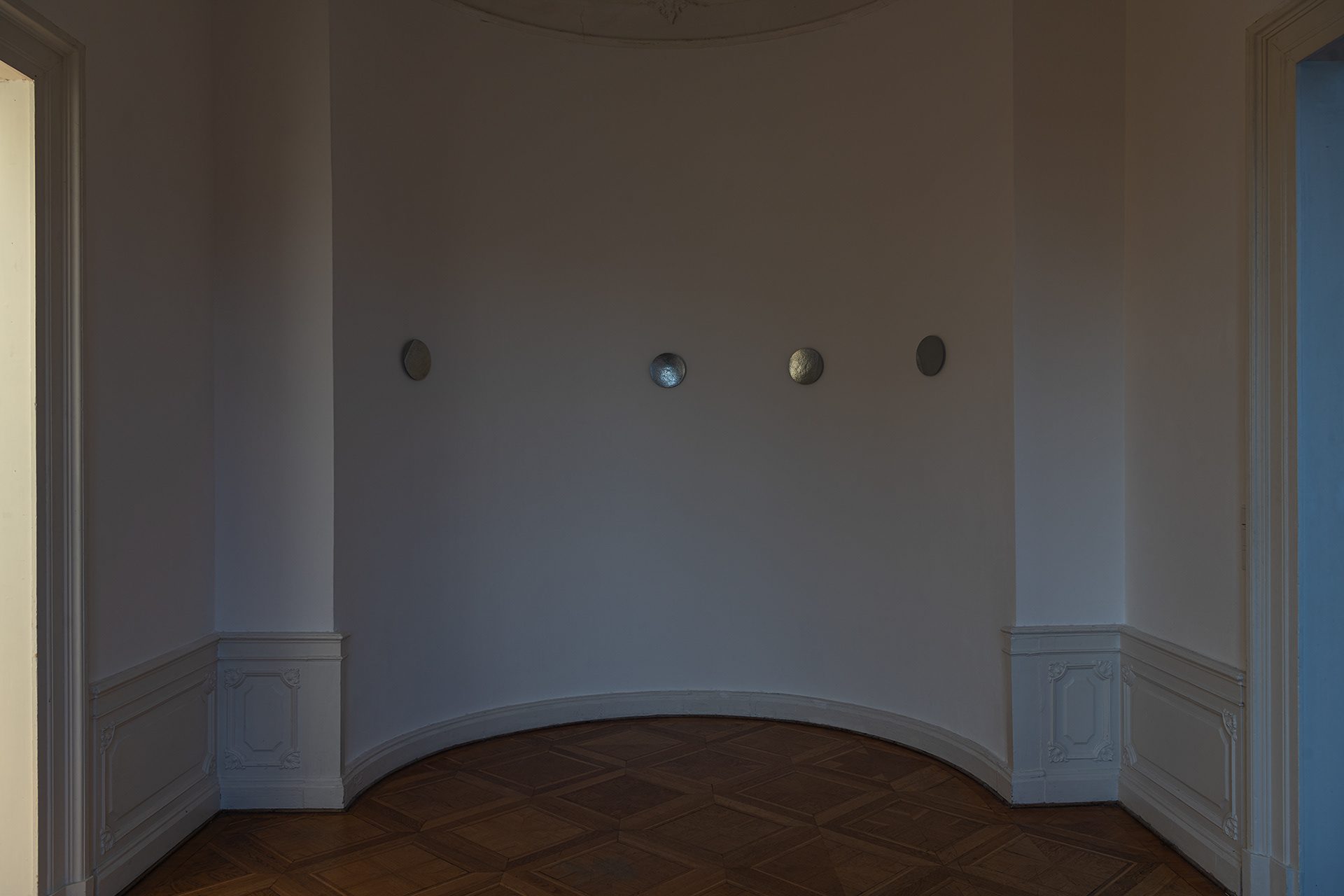 The work was developed as part of the 2025 Master Students‘ Exhibition for the Kunstverein Braunschweig and deals with the circular perception of time. Seven hammered zinc sheet discs represent the phases of the moon that the exhibition went through from October 18 to November 9, 2025. They are distributed throughout the unlit room and thus reflect only the natural light and the light coming in from the neighboring rooms. The sandblasted surfaces represent the part of the moon that remains hidden from us. The work deals with visibility and invisibility and addresses the limits of our perception. It also invites visitors to linger in the room for a longer period of time, to observe the change in lightand thus the passage of time, or to return